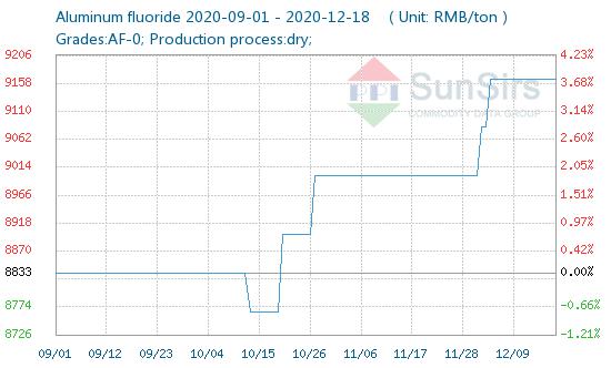 The price of upstream fluorite was rising, the price of hydrofluoric acid was stable and there was a slight increase, and some aluminum fluoride companies pushed up the ex-factory price. According to the data of SunSirs, the domestic aluminum fluoride price was 9,166 RMB/ton on December 18, which was the same as the price of aluminum fluoride at the beginning of the week.