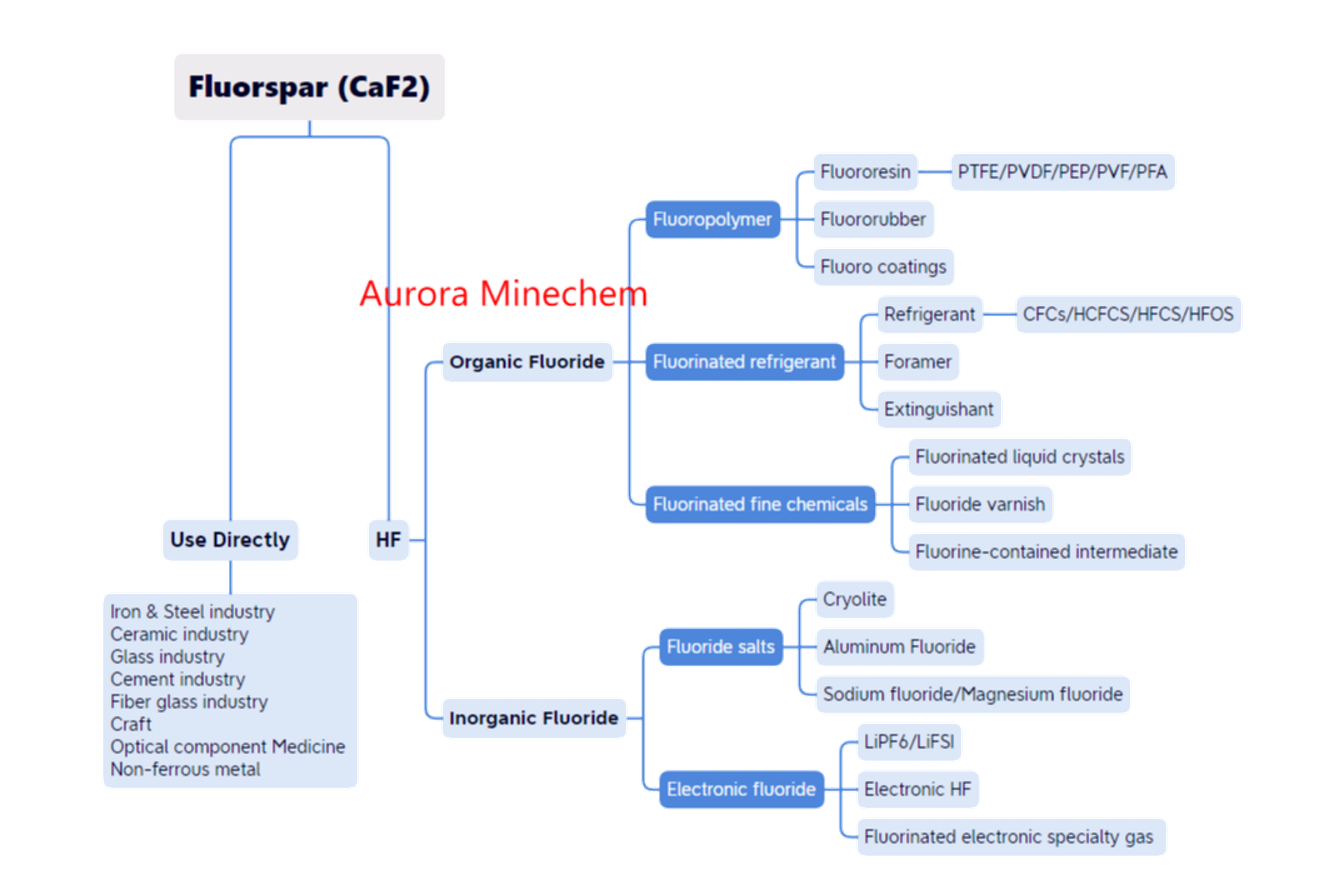 Hydrofluoric acid is the primary feedstock for the manufacture of virtually all fluorine-bearing chemicals, particularly refrigerants and fluoropolymers, and is also a key ingredient in the processing of aluminum and uranium. Fluorspar was also used in cement production, in enamels, as a flux in steelmaking, in glass manufacture, in iron and steel casting, and in welding rod coatings.